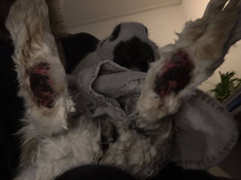 Als we de hakken niet zouden beschermen is het bij belasting gelijk weer kapot , dit door er ook nog geen haar op de poten is gegroeid. We beschermden zijn pootjes met watten, verband en daarover heen babysokjes waar de tenen vanaf zijn geknipt.