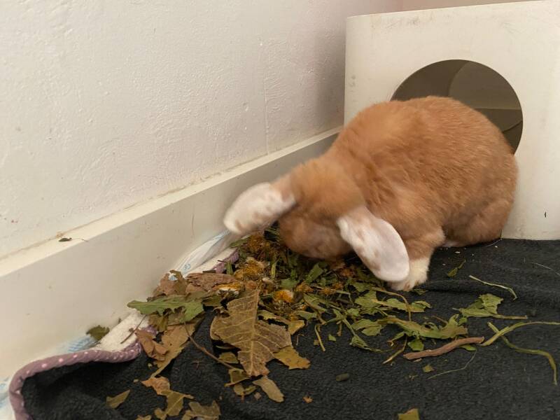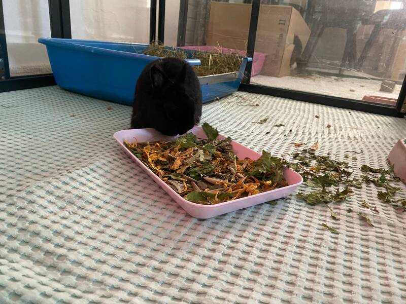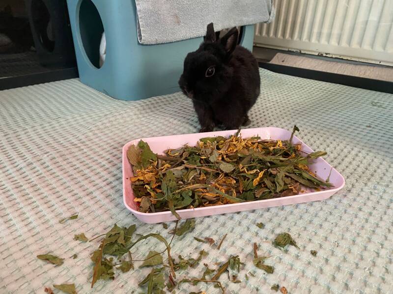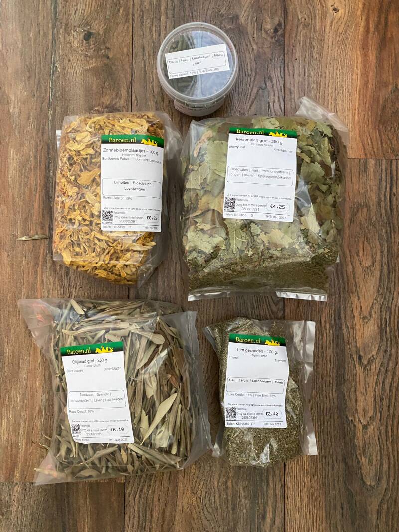 Olijfblad voor het Immuunsysteem en luchtwegen, Zonnebloemblaadjes voor zijn bijholtes en luchtwegen, Kersenblad ondersteunt ook het Immuunsysteem, Tijm kruiden en tijm persbrokje ook voor de luchtwegen... nou het is een feestmaal en Cedric dook gelijk in de schaal om heerlijk te smullen.