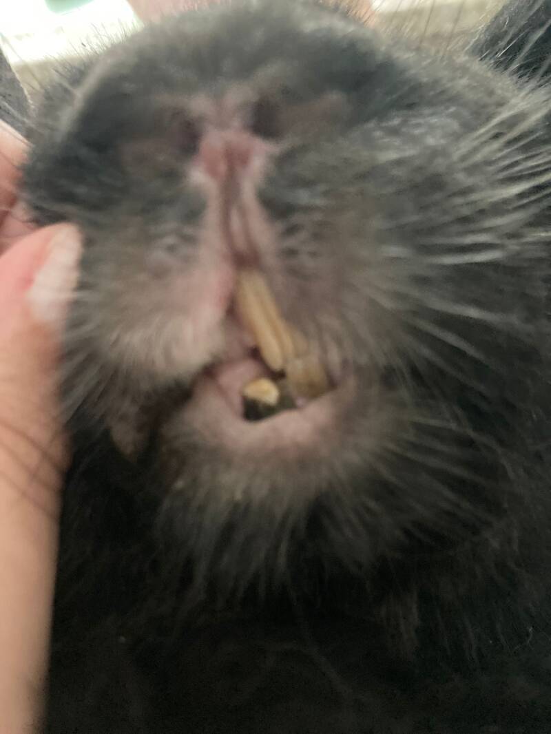 Ze is naar de dierenarts gegaan en 1 van de snijtanden onder was afgebroken en gespleten. Er is gestart met antibiotica met oog op de ontsteking die er onder zat en we hoopten dat de snijtand zou herstellen, en weer opnieuw netjes zou aangroeien. Dit bleek niet het geval en de stand van die snijtanden is ook zo scheef dat dit ook niet meer keurig recht zou aangroeien.