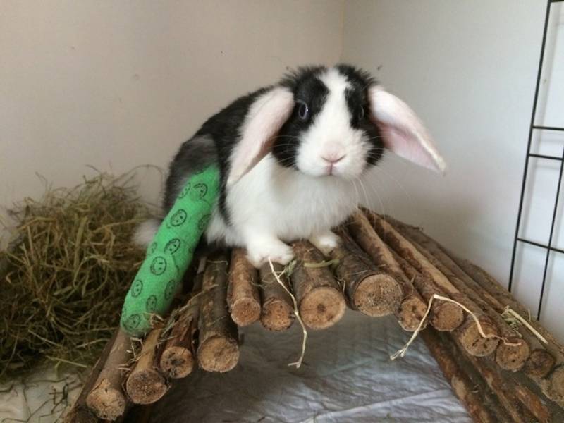 Jay werd gratis aangeboden op marktplaats, hij zou een hersenvliesontsteking hebben gehad en hierdoor was zijn koppie scheef komen te staan. Er stond bij geschreven dat het verder geen kwaad kon en dat het konijntje zich prima er mee kon redden. Bij ons gingen alle alarm bellen al rinkelen toen we de foto's zagen en wisten we gelijk dat het EC was en geen hersenvliesontsteking. Jay is uit de kop van Noord Holland gehaald en kwam hier in de opvang waar we gelijk zijn gestart met de medicatie tegen EC. Jay werd stabiel en met de tijd is zijn koppie mooi recht komen te staan en gaat het goed met het manneke. Door Jay de EC in ernstige mate had en de kans dat het terug komt aanwezig is hebben we besloten Jay niet ter adoptie te doen maar blijft hij hier in de opvang wonen. Jay woont samen met Jumpie, deze dame heeft een brand overleeft en haar vriendje in de brand verloren. Ze is nu haar traumaatjes kwijt en zeer gelukkig met Jay.