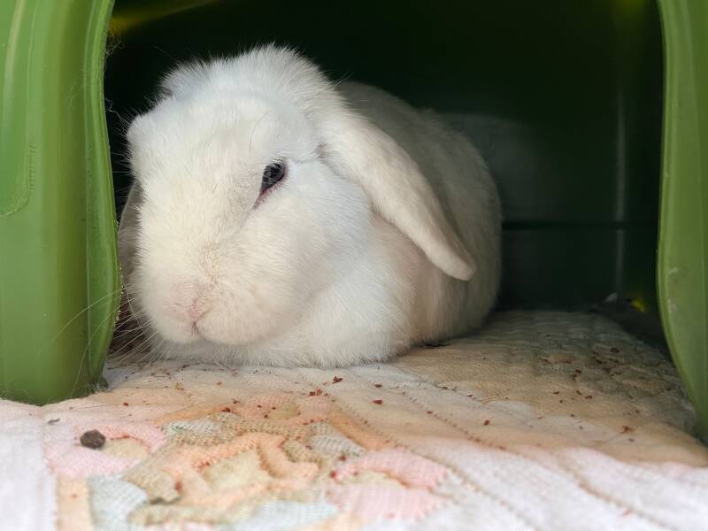 Rex konijnen zoals Puk hebben vaak last van sore hocks door hun dunne vacht op de voetzolen, waardoor ze een zachte ondergrond nodig hebben. Dat maakt hun adoptie soms lastiger, en zo is Puk bij ons gekomen.